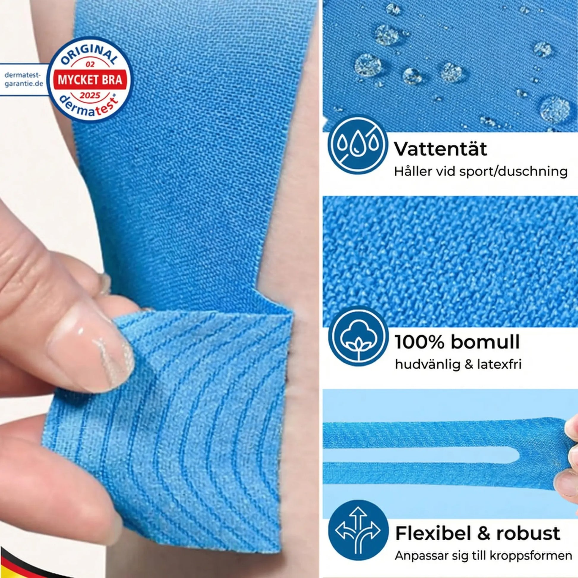 Materialet låter huden andas och kan även användas säkert på känslig hud.