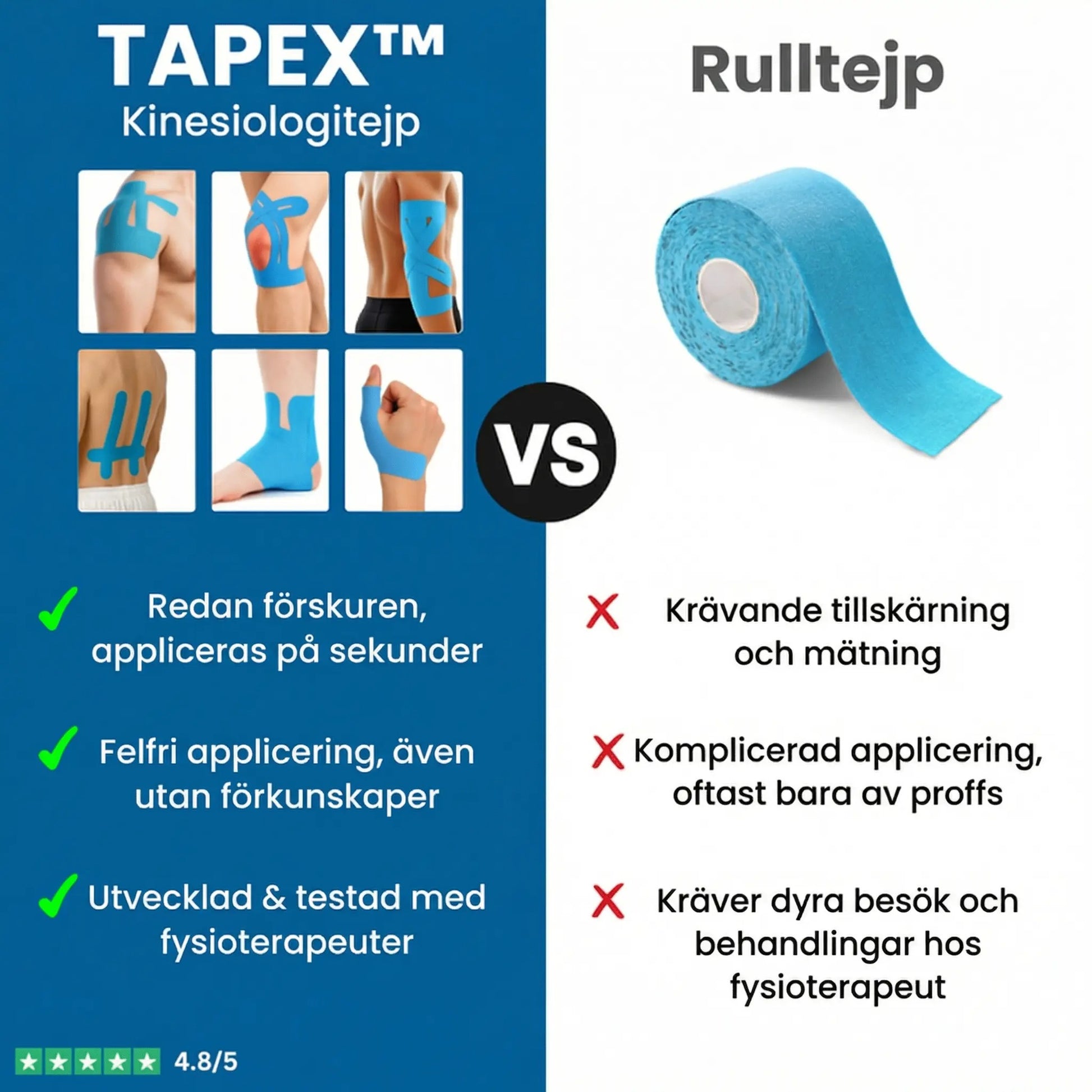 Vår tejp är utvecklad i samarbete med fysioterapeuter och är färdigutformad för direkt användning.